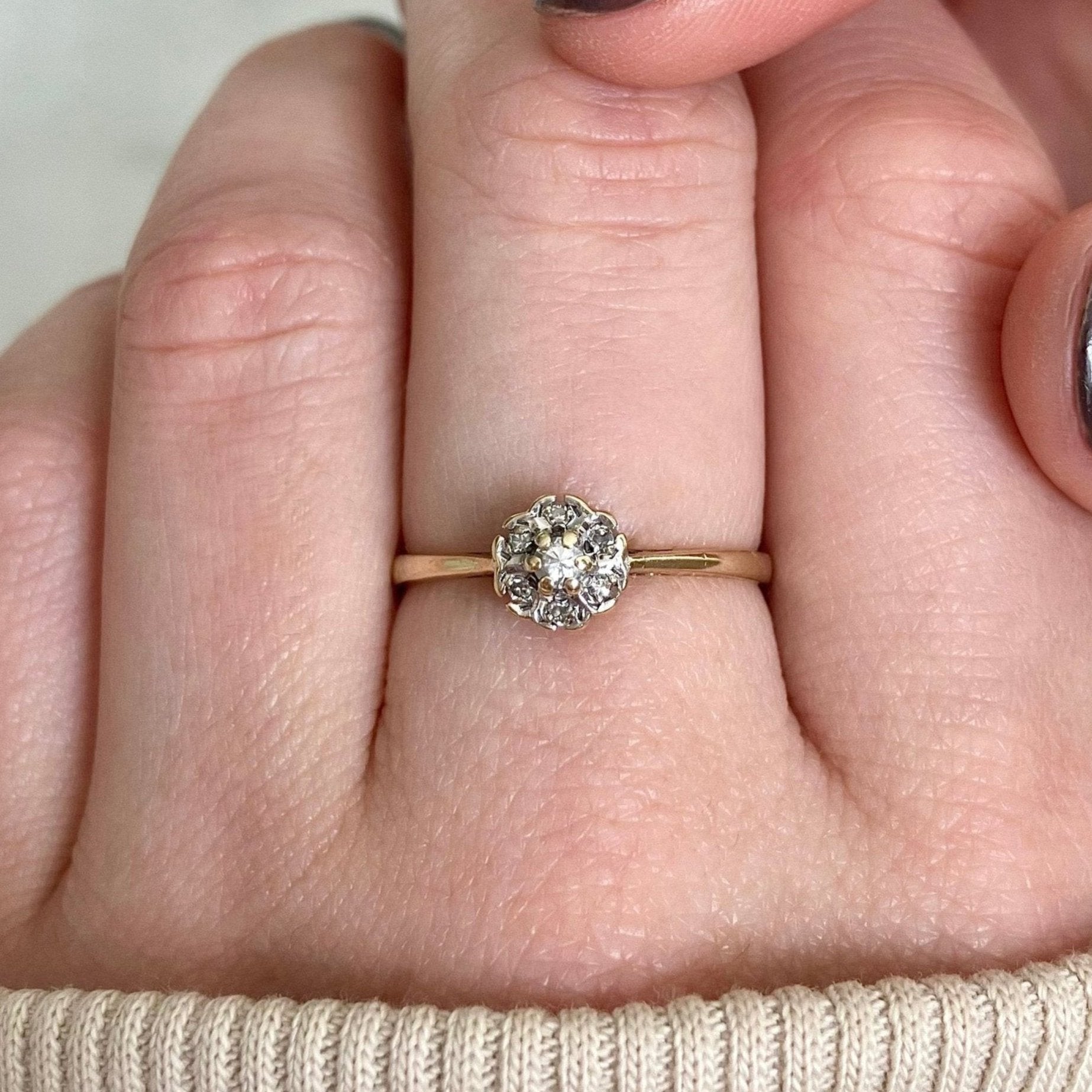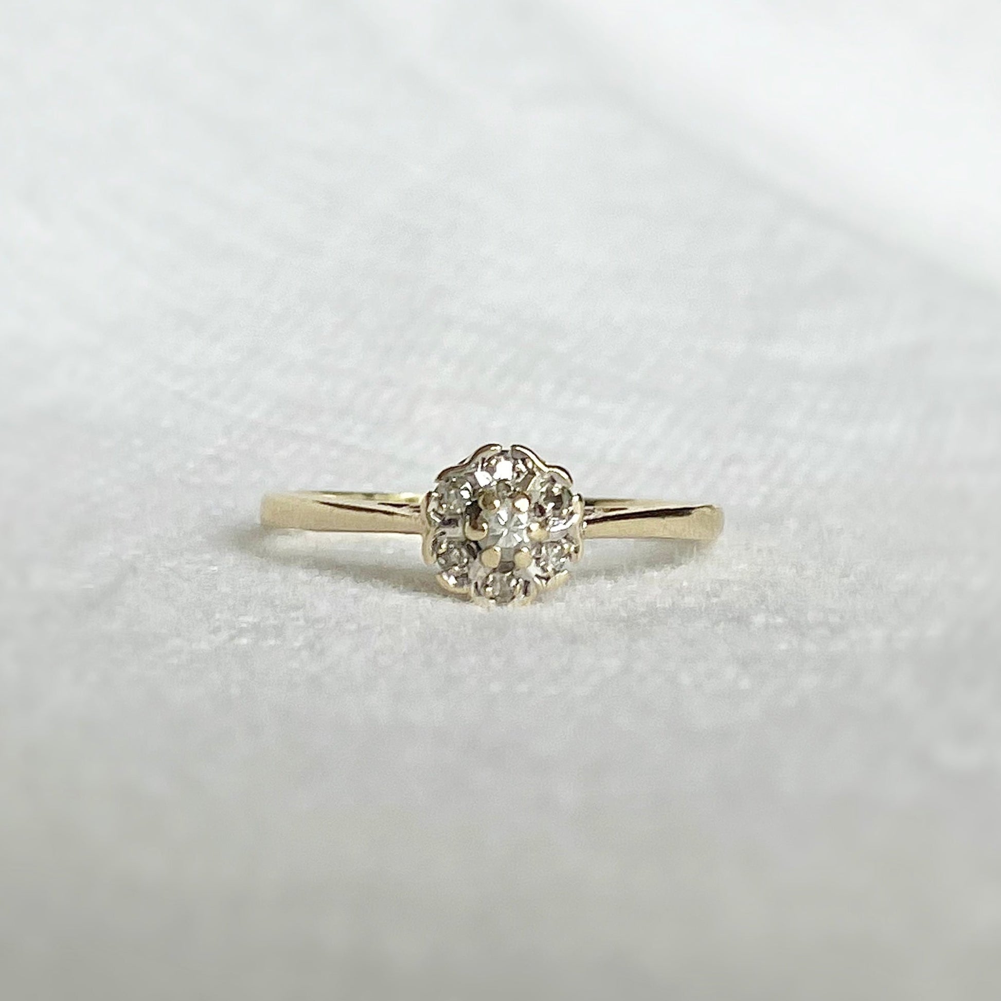 A diamond floral style cluster ring set on a 9k gold band. All vintage rings are one-off, high-quality pieces that have been pre-loved. A sustainable choice, they are designed to last a lifetime.