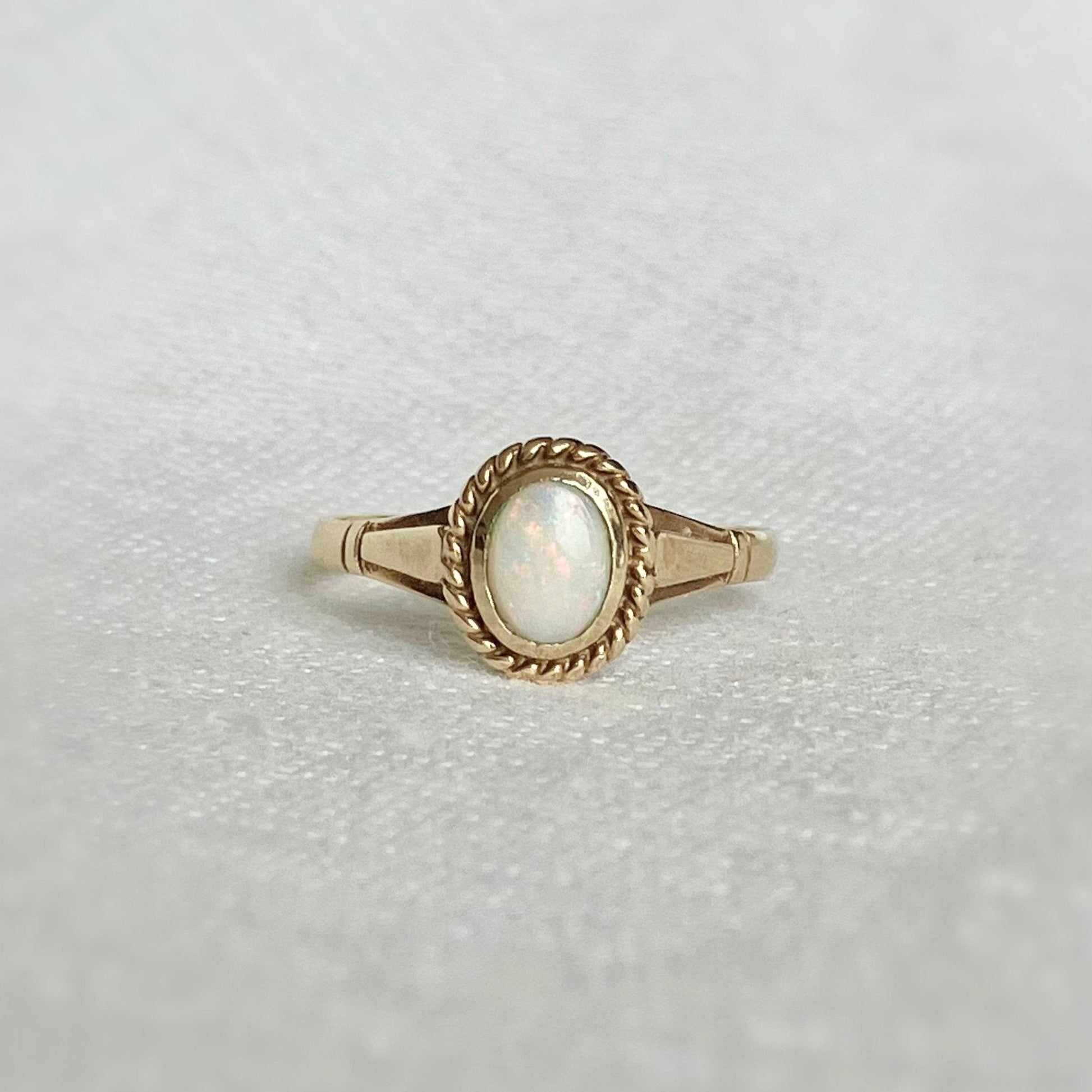 An iridescent opal set in a 9k gold engraved surround. All vintage rings are one-off, high-quality pieces that have been pre-loved. A sustainable choice, they are designed to last a lifetime.