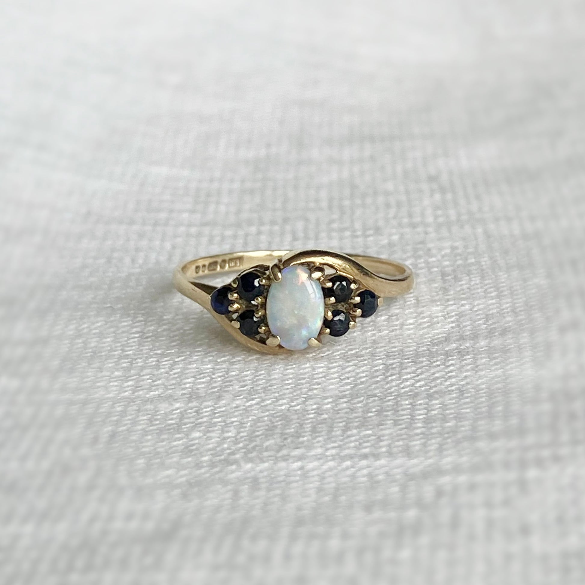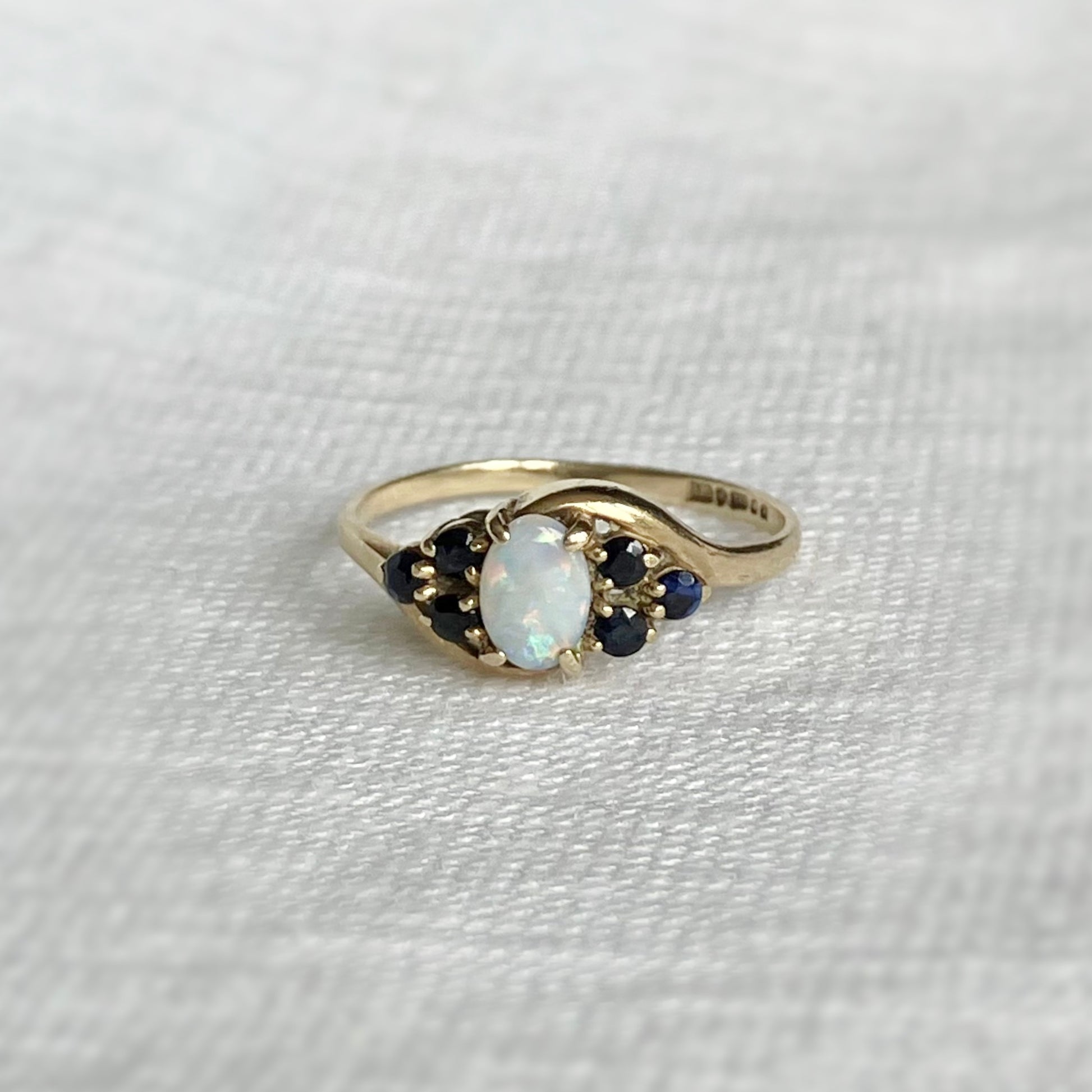 A statement sapphire and opal ring set on a dainty 9 carat brushed gold band. All vintage rings are one-off, high-quality pieces that have been pre-loved. A sustainable choice, they are designed to last a lifetime.