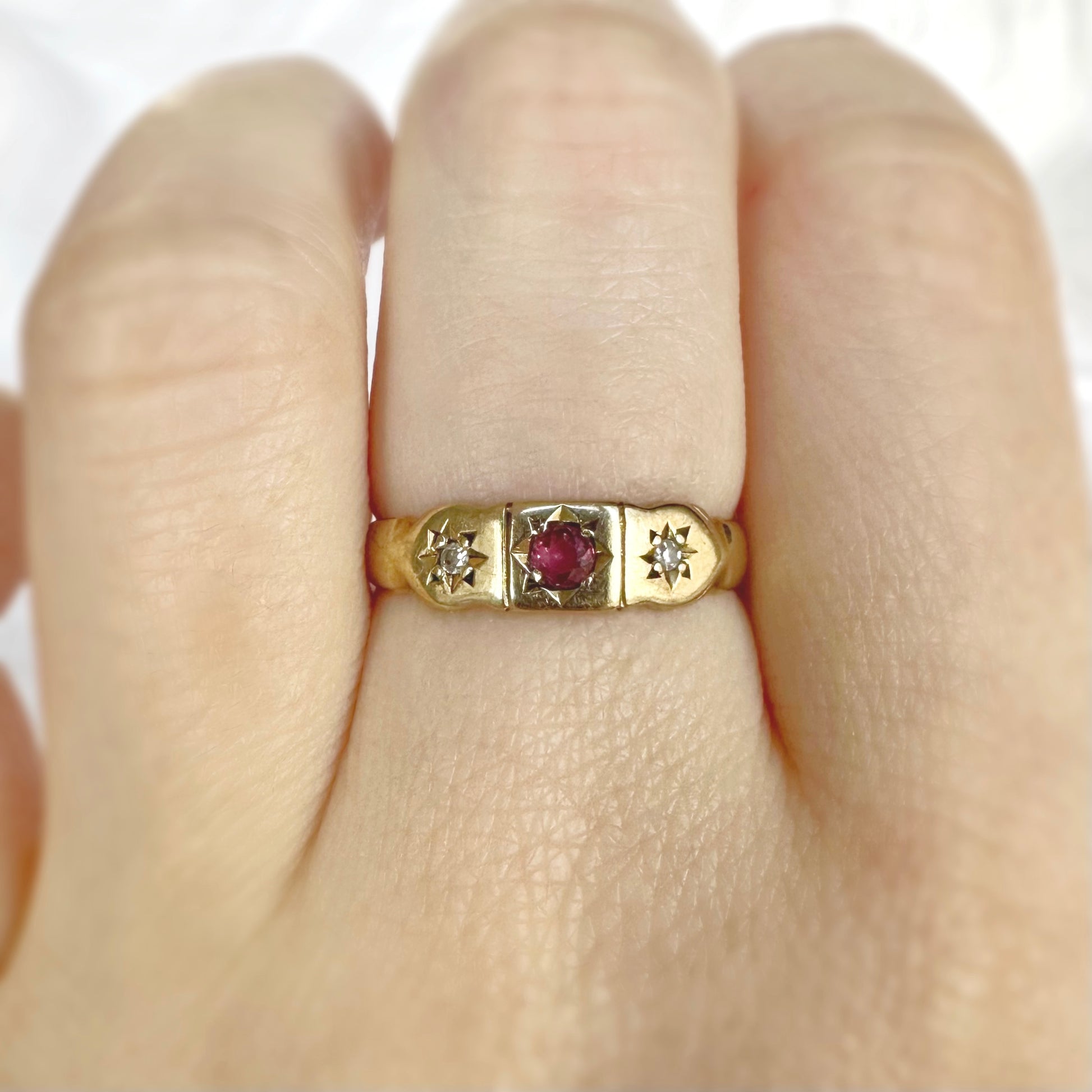 A vintage ruby and diamond band ring, featuring a central ruby with diamonds either sides engraved with a star detail, set on 9ct gold band. All vintage rings are one-off, high-quality pieces that have been pre-loved. A sustainable choice, they are designed to last a lifetime.