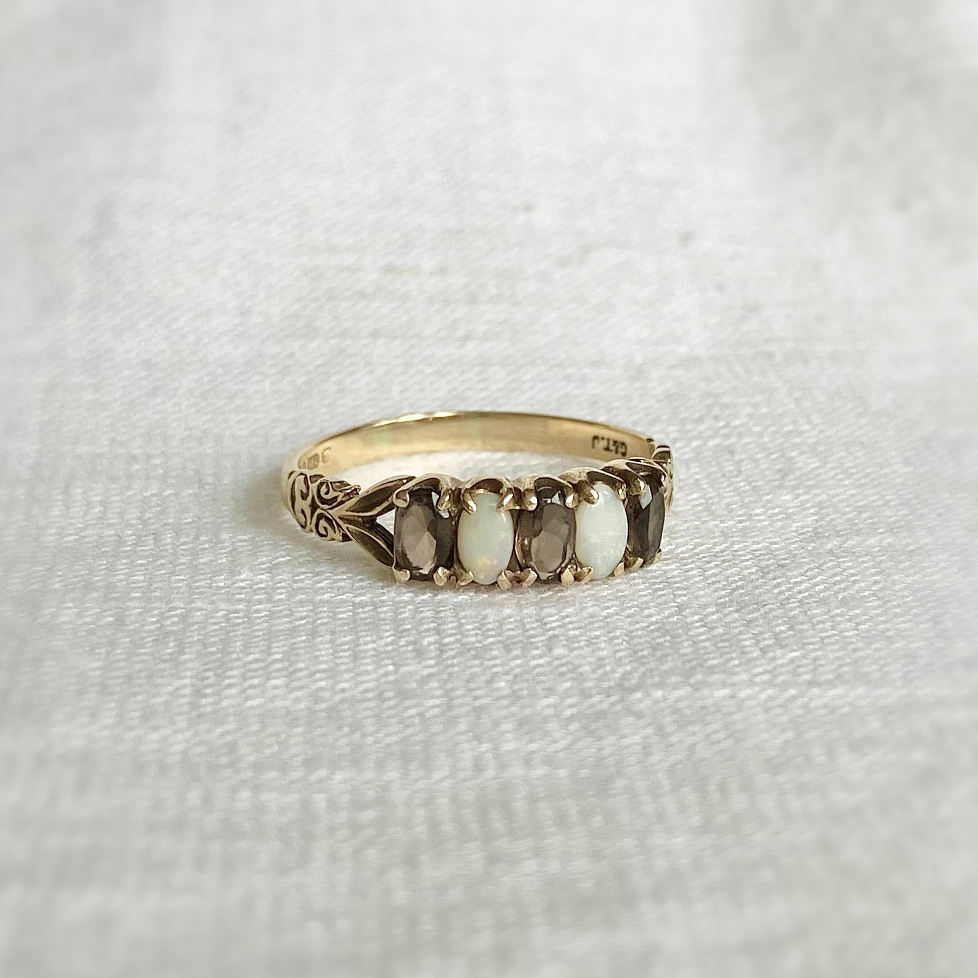 An Opal and Smokey Quartz five stone ring set on a 9ct gold partially engraved band. All vintage rings are one-off, high-quality pieces that have been pre-loved. A sustainable choice, they are designed to last a lifetime.