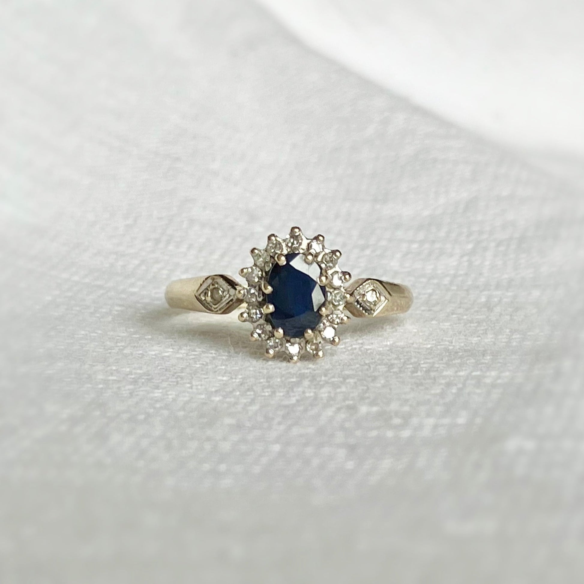 A statement 9ct gold sapphire and 18-diamond cluster ring. All vintage rings are one-off, high-quality pieces that have been pre-loved. A sustainable choice, they are designed to last a lifetime.