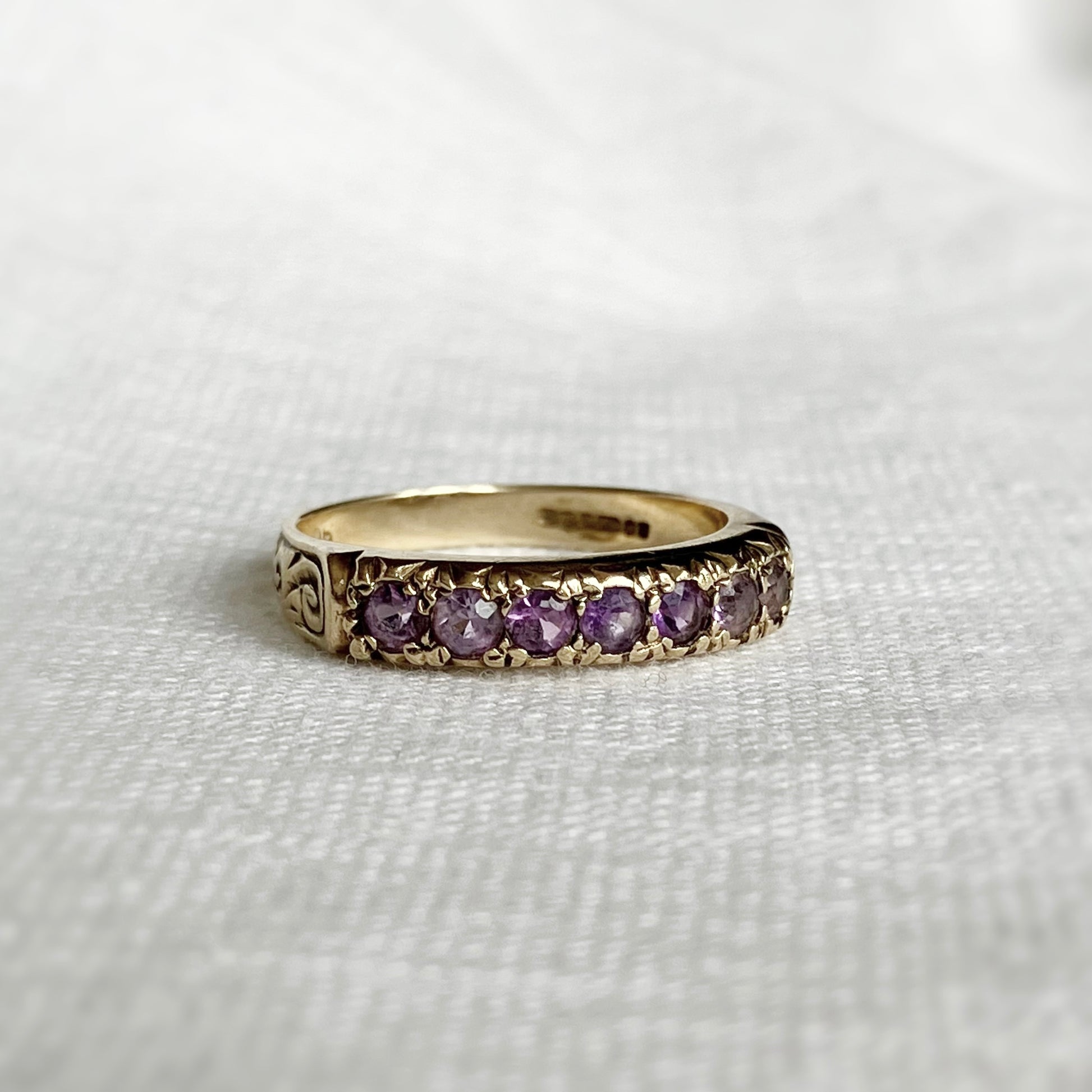 A sparkling amethyst half eternity ring set in a 9k gold partially engraved band. All vintage rings are one-off, high-quality pieces that have been pre-loved. A sustainable choice, they are designed to last a lifetime.
